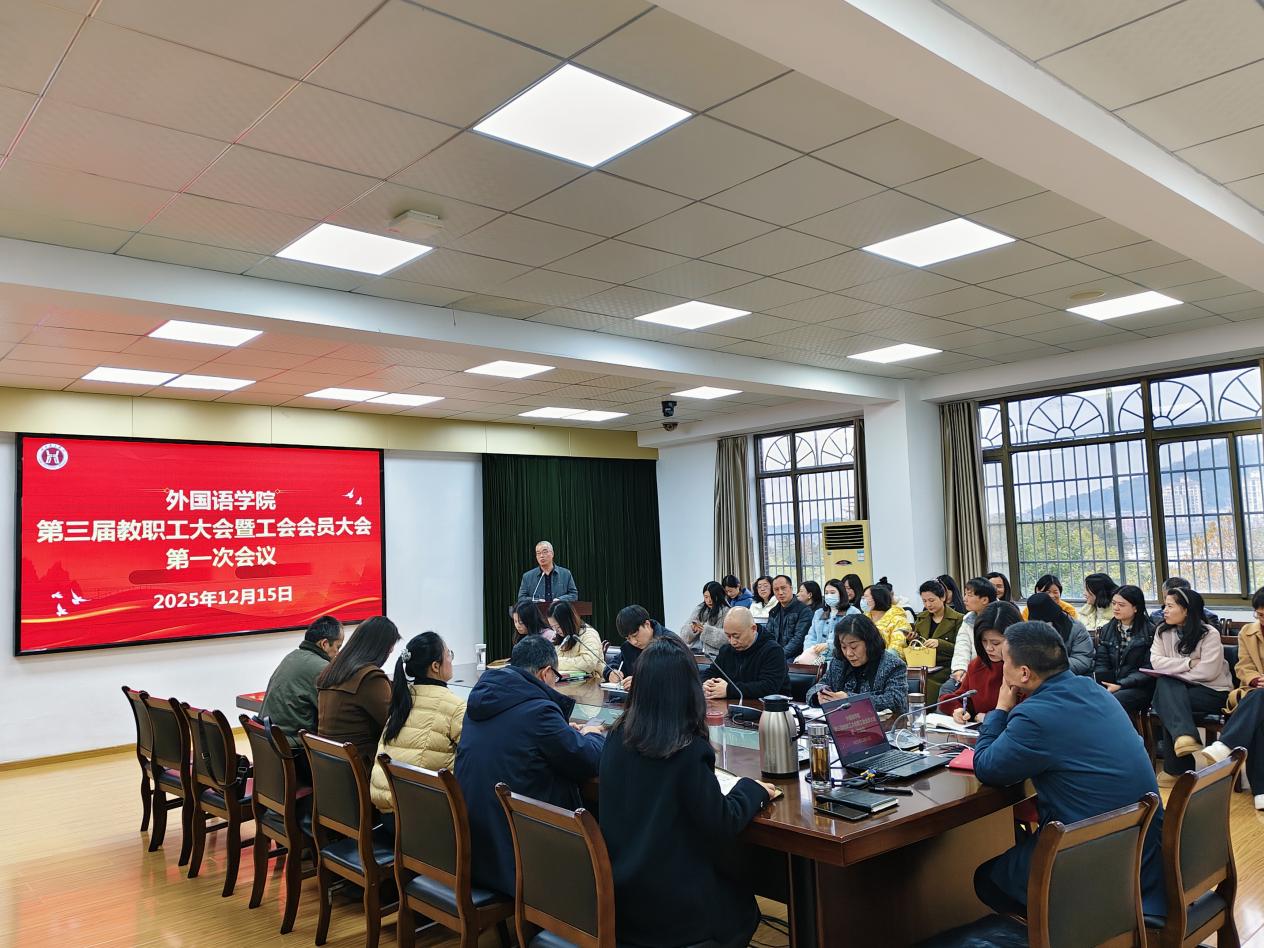 本网消息 12月15日下午,外国语学院在X2-304室隆重召开第三届教职工大会暨工会会员大会第一次会议。会议由党总支副书记易定国主持。